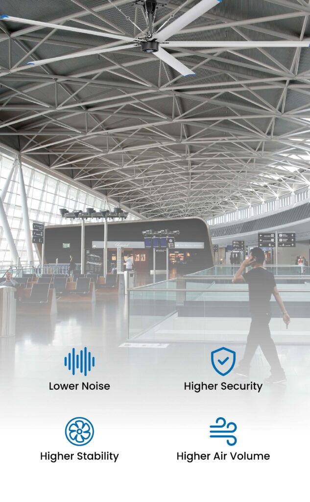 Airports are increasingly focusing on sustainability, and HVLS fans provide an eco-friendly solution. Their energy-efficient operation helps reduce the carbon footprint of airport facilities, contributing to greener aviation practices.