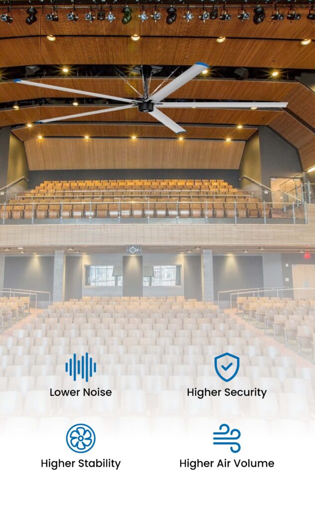 In large spaces like auditoriums, vibration from fans can be distracting. HVLS fans are engineered to minimize vibration, ensuring a smooth and stable operation that doesn’t interfere with performances or events.
