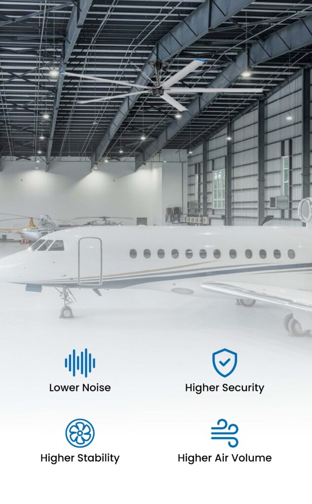 Hangars require robust equipment, and HVLS fans are built with durability in mind. Their solid construction ensures they can withstand the rigours of hangar environments, providing reliable performance over time.