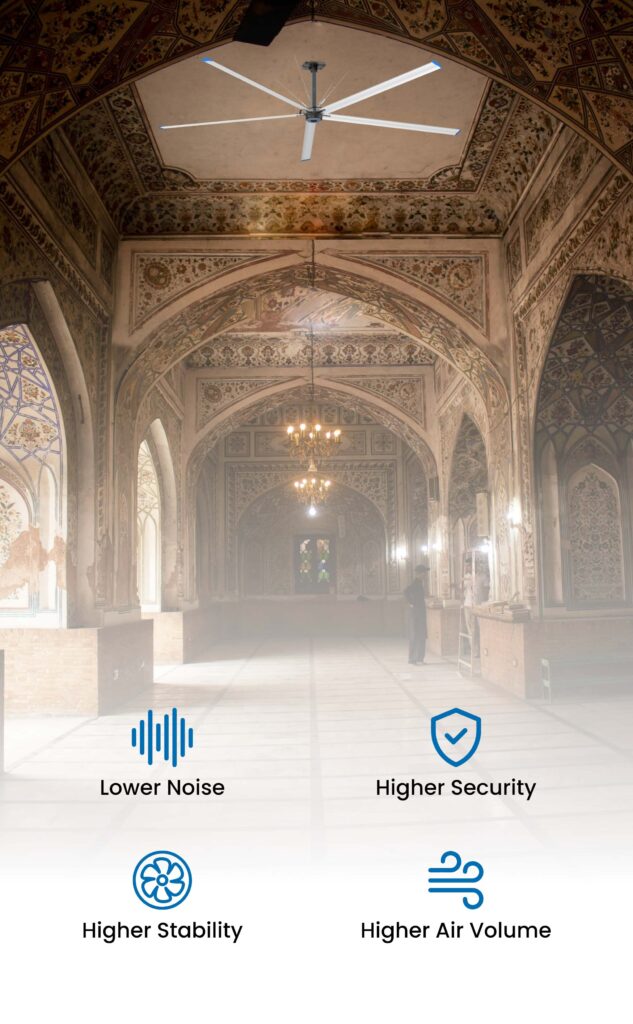 In mosques with large congregational areas, HVLS fans optimize air circulation, preventing the build-up of hot or cold spots. This helps maintain a comfortable environment during prayers and events, regardless of the size of the space.