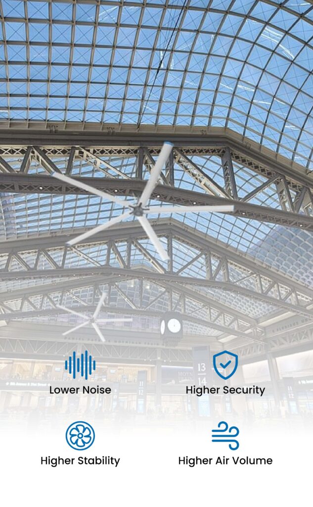 Energy efficiency is a priority in public spaces, and HVLS fans support this by reducing the need for additional cooling systems. Their low energy consumption helps lower operational costs while maintaining comfort.
